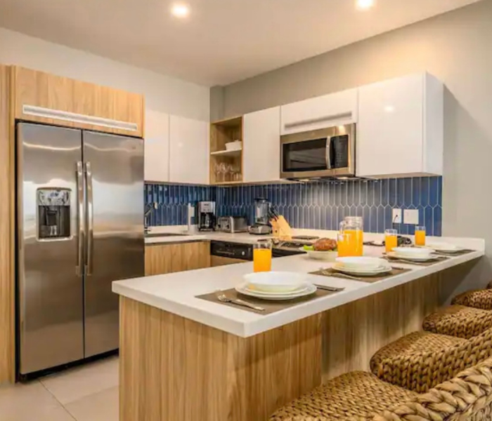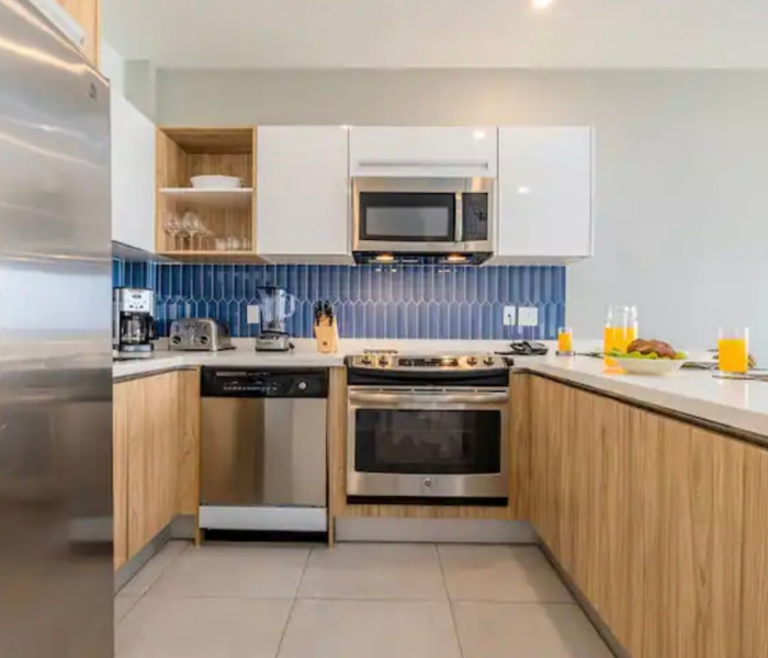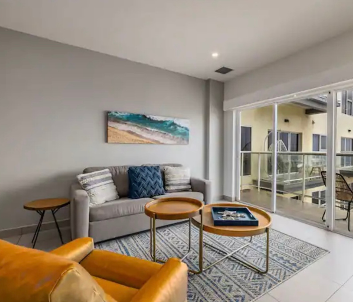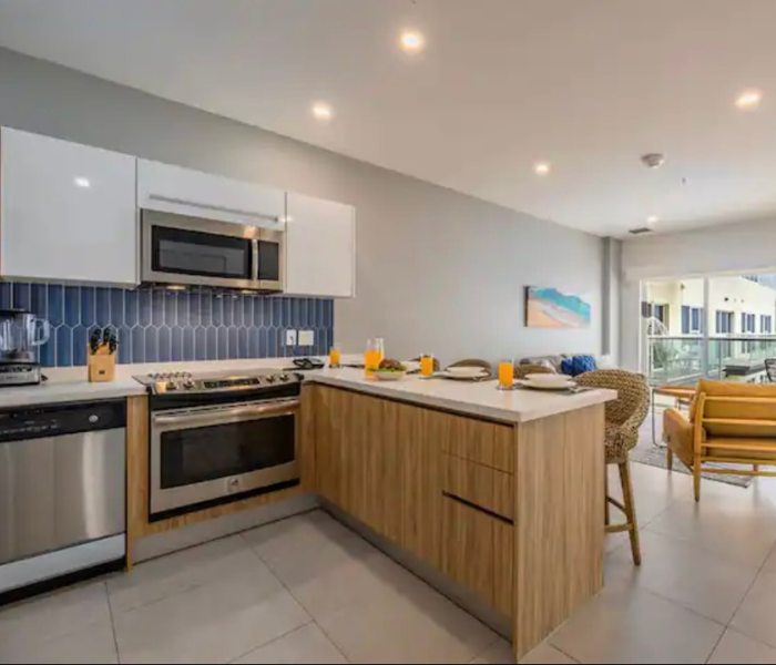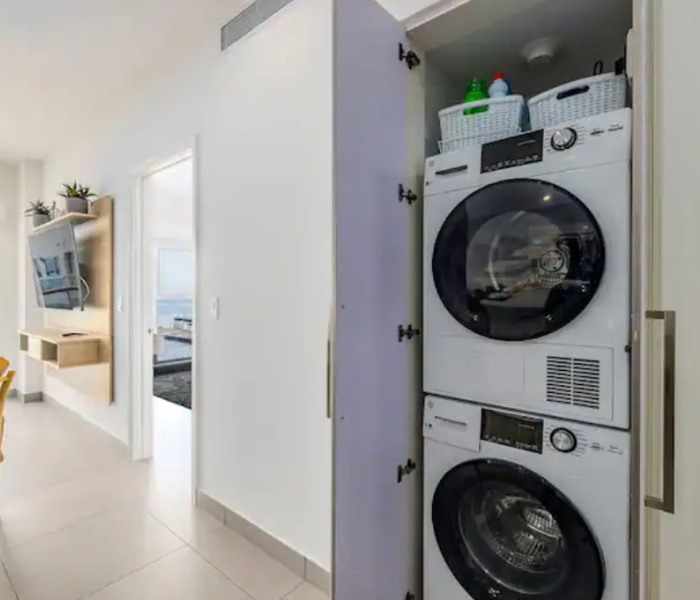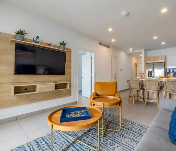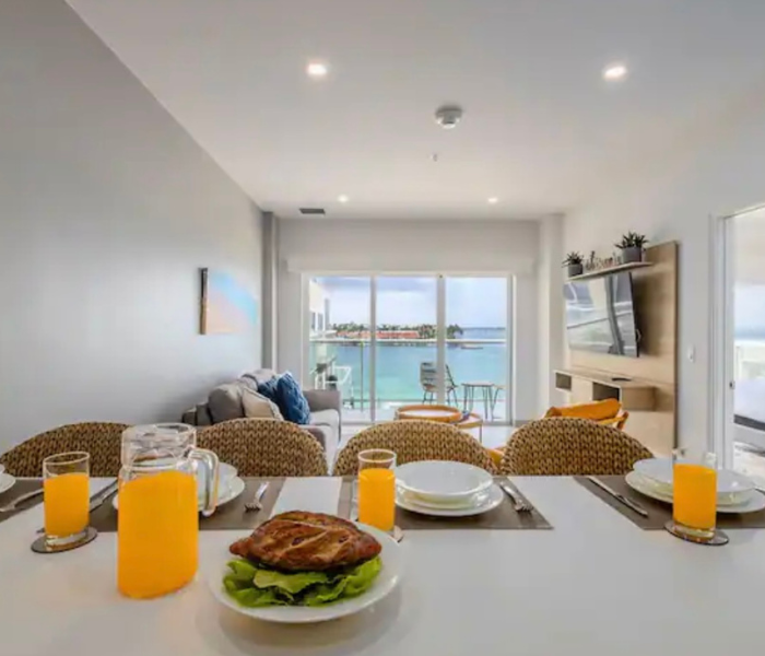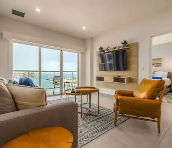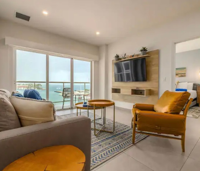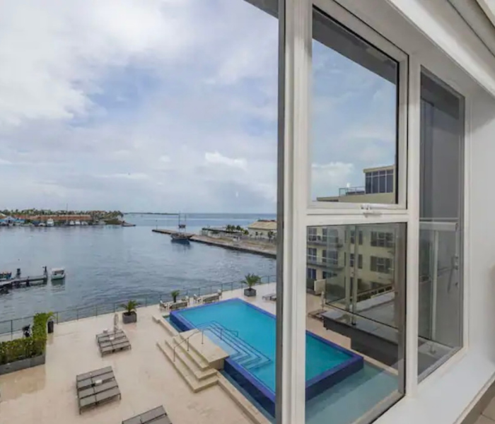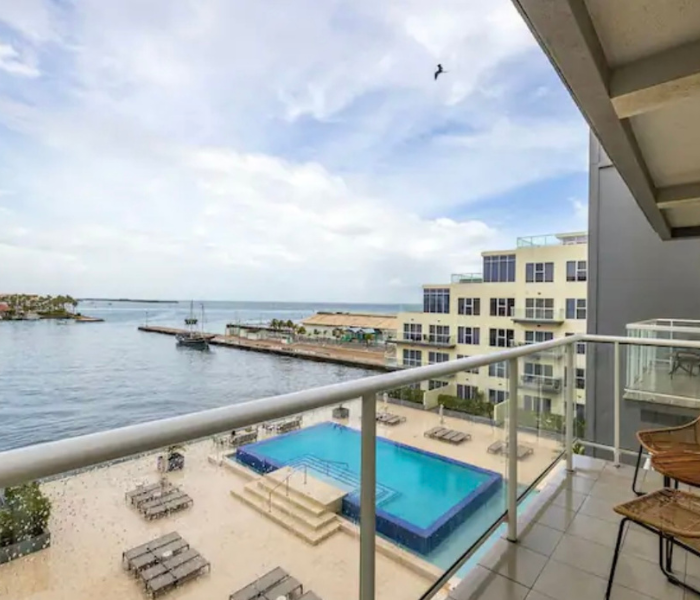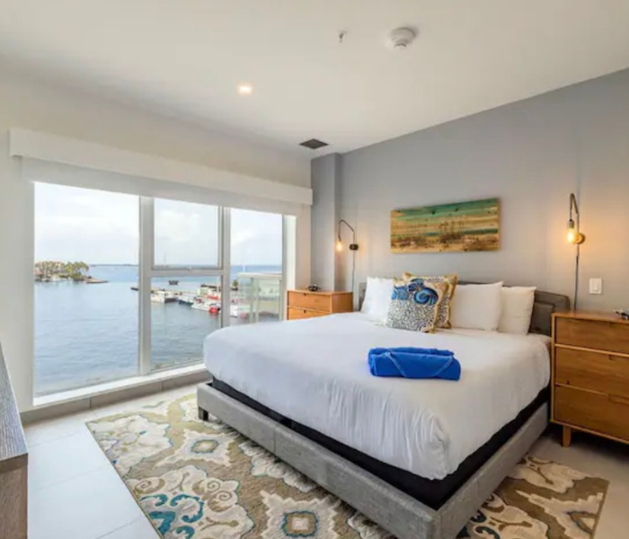 Ubicado en el quinto piso con vistas a la hermosa bahía. Disfruta de la brisa de Aruba con una copa de vino. La cocina y la sala son un amplio espacio abierto. Master bdr. tiene una enorme ventana con vistas al puerto. Cocina totalmente equipada. La unidad viene con 3 televisores, wifi por toda la propiedad. Siéntete completamente relajado y bienvenido aquí, donde serás capturado por las atracciones y comodidades del complejo. Jacuzzis en la azotea, un gimnasio con vistas al mar. Piscina con bar. Espacio de trabajo en el segundo piso.