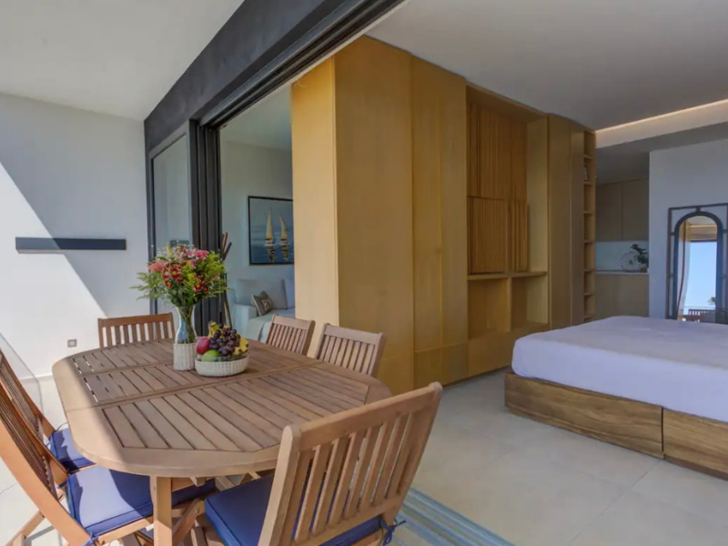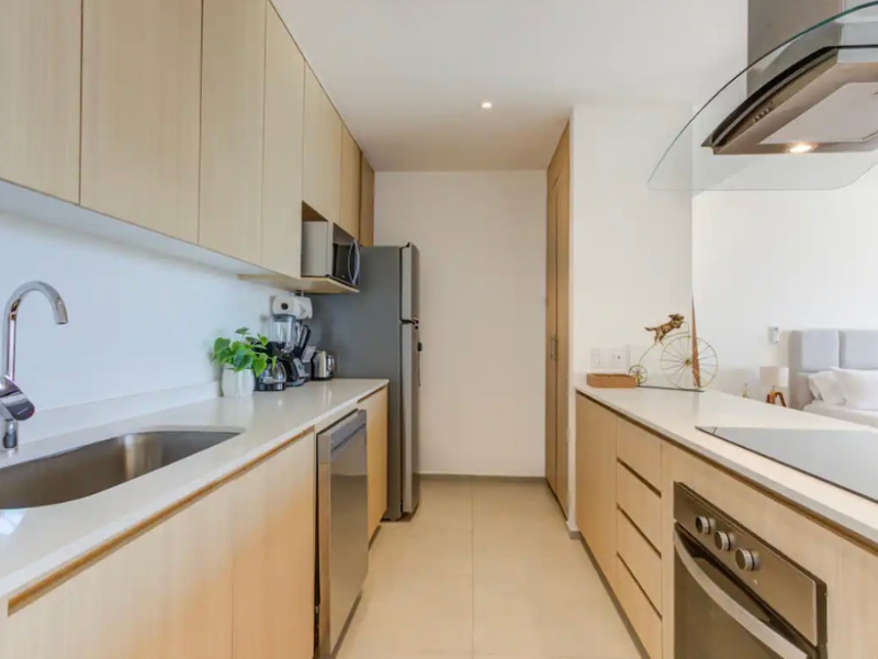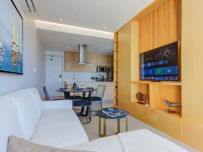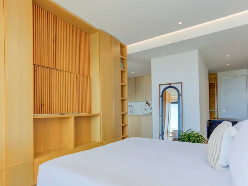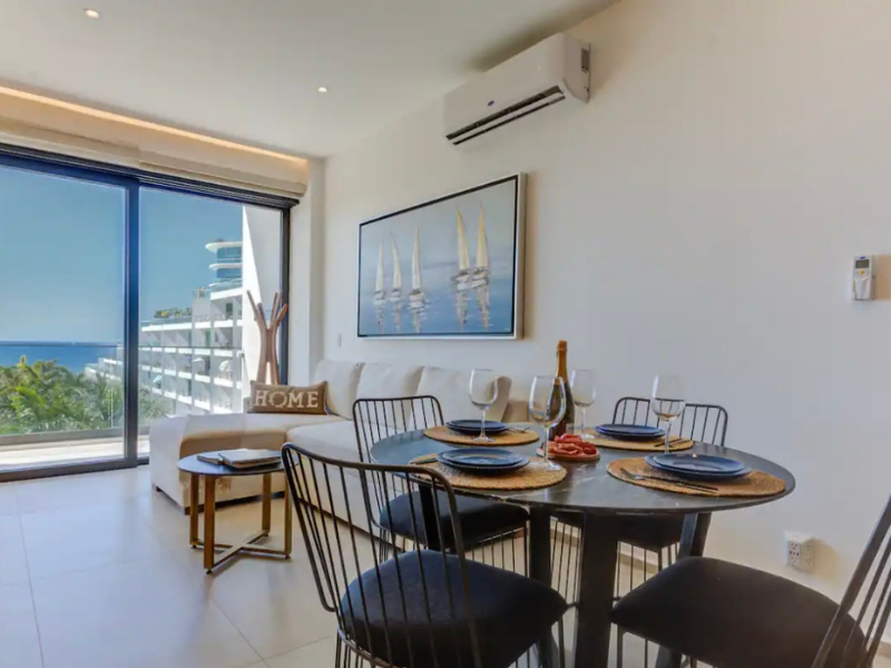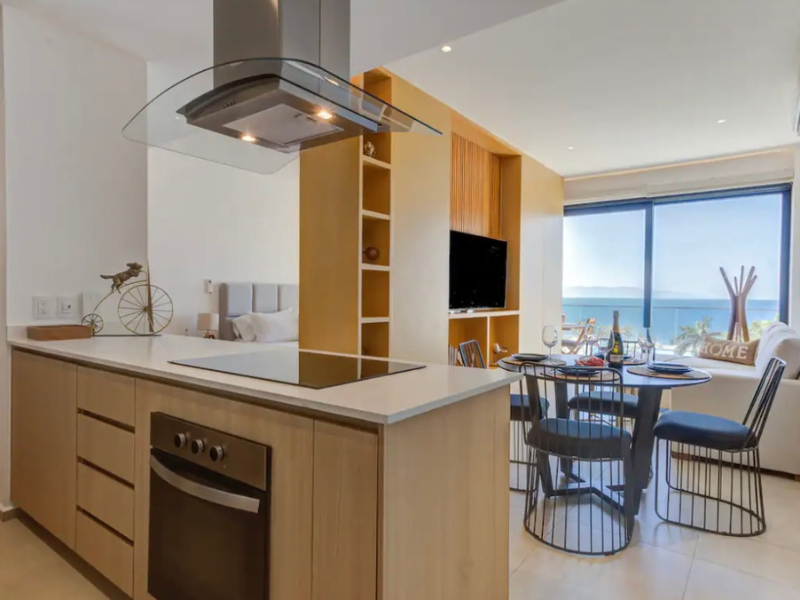 Impresionante vista al mar desde su amplia ventana. El espacio también cuenta con una cómoda cama king size para una noche de descanso reparador. Además, el departamento incluye una sala de estar, una cocina totalmente equipada y un baño moderno con artículos de tocador de alta calidad. Con su ubicación privilegiada y todas las comodidades que ofrece, este departamento es perfecto para aquellos que buscan experimentar lo mejor del estilo de vida en la playa.